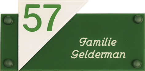 Gravoglas is een luxe en tegelijk stevige kunststofsoort (3 mm dikte), met de uitstraling van gekleurd glas, welke uitstekend geschikt is voor gebruik in en rondom uw woning. De tekst wordt in alle gravoglas-naamborden gegraveerd, waardoor uw naam niet weg kan slijten of vervagen. Het bijzondere aan gravoglas is dat het aan de achterzijde ingegraveerd wordt, dit in tegenstelling tot andere kunststofsoorten. Hierdoor blijft het materiaal aan de voorzijde glad en krijgt het een hele luxe uitstraling. Tot slot: de gravoglas-naamborden zijn standaard voorzien van schroefgaten (tenzij anders vermeld) en worden geleverd met afstandbusjes en afdekdopjes waardoor u het naambord eenvoudig op een korte afstand van de muur kunt monteren.