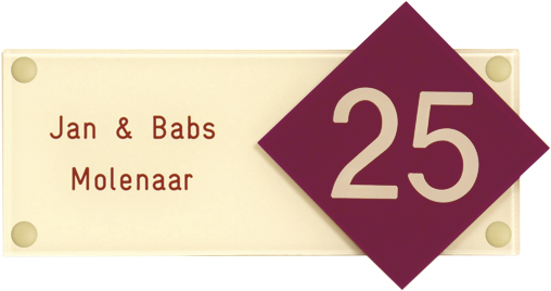 Gravoglas is een luxe en tegelijk stevige kunststofsoort (3 mm dikte), met de uitstraling van gekleurd glas, welke uitstekend geschikt is voor gebruik in en rondom uw woning. De tekst wordt in alle gravoglas-naamborden gegraveerd, waardoor uw naam niet weg kan slijten of vervagen. Het bijzondere aan gravoglas is dat het aan de achterzijde ingegraveerd wordt, dit in tegenstelling tot andere kunststofsoorten. Hierdoor blijft het materiaal aan de voorzijde glad en krijgt het een hele luxe uitstraling. Tot slot: de gravoglas-naamborden zijn standaard voorzien van schroefgaten (tenzij anders vermeld) en worden geleverd met afstandbusjes en afdekdopjes waardoor u het naambord eenvoudig op een korte afstand van de muur kunt monteren. Gravoglas een zeer luxe kunststofsoort dat tegen een stootje kan!