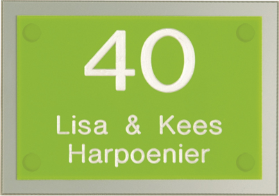 Perspex is een stevige kunststofsoort (3 mm dikte), welke uitstekend geschikt is voor gebruik in en rondom uw woning. De tekst wordt in alle perspex-naamborden gegraveerd, waardoor uw naam niet weg kan slijten of vervagen. De transparante perspex naamborden worden aan de achterzijde ingegraveerd (waardoor de voorkant glad blijft) en de gekleurde perspex naamborden worden aan de voorzijde ingegraveerd. Tot slot: de perspex-naamborden zijn standaard voorzien van schroefgaten (tenzij anders vermeld) en worden geleverd met afstandbusjes en afdekdopjes waardoor u het naambord eenvoudig op een korte afstand van de muur kunt monteren. Perspex een luxe kunststofsoort dat tegen een stootje kan!