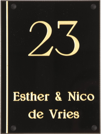 Perspex is een stevige kunststofsoort (3 mm dikte), welke uitstekend geschikt is voor gebruik in en rondom uw woning. De tekst wordt in alle perspex-naamborden gegraveerd, waardoor uw naam niet weg kan slijten of vervagen. De transparante perspex naamborden worden aan de achterzijde ingegraveerd (waardoor de voorkant glad blijft) en de gekleurde perspex naamborden worden aan de voorzijde ingegraveerd. Tot slot: de perspex-naamborden zijn standaard voorzien van schroefgaten (tenzij anders vermeld) en worden geleverd met afstandbusjes en afdekdopjes waardoor u het naambord eenvoudig op een korte afstand van de muur kunt monteren. Perspex een luxe kunststofsoort dat tegen een stootje kan!